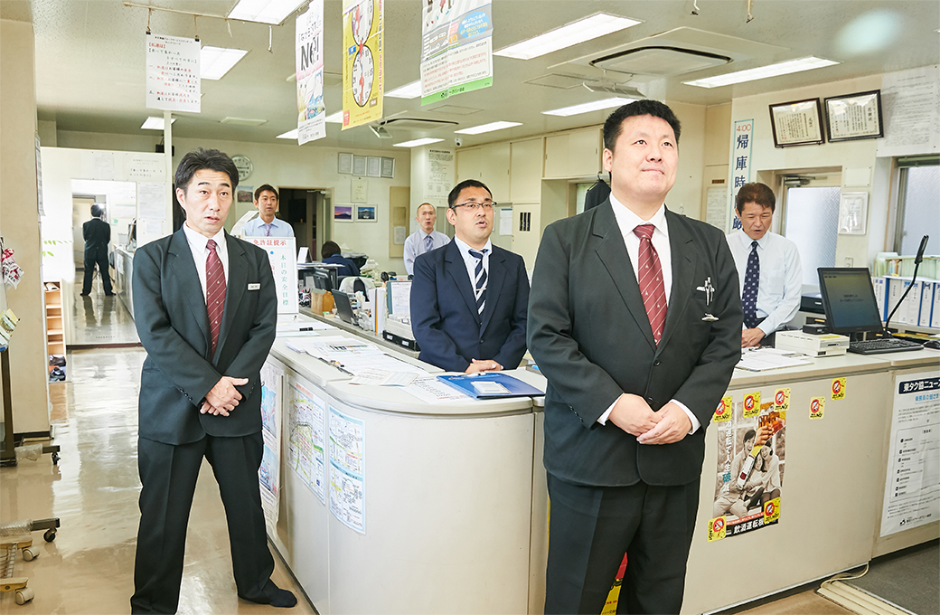 次いで、乗務員の全員が集まっての点呼を行います。ここで、安全運転やその日の注意事項などを確認。また、お客様に快適なサービスを提供するための、挨拶訓練も行います。挨拶の基本さえ徹底していれば、お客様からの苦情やクレームはほとんど発生しません。