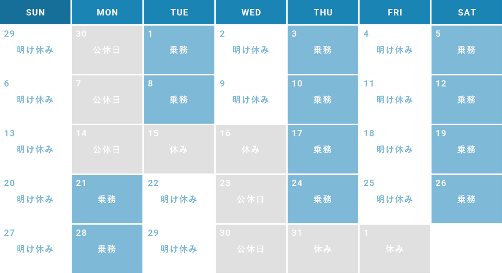 乗務員の勤務は、1勤務の実働が14.5時間のシフト制であり、うち3時間が休憩時間となります。また1ヶ月の勤務は基本12日で、勤務の翌日は必ず休み(明け番休息日)となります。明け番休息日以外に、月6〜8日の休日(公休日)があります。お休みが多いこと、シフトは本人の希望を十分考慮して決定することなどから、心身に負荷がかからず、プライベートの時間も充実できる環境です。ここでは、乗務員のおもな1日の流れ、1ヶ月の勤務シフト例についてご紹介します。